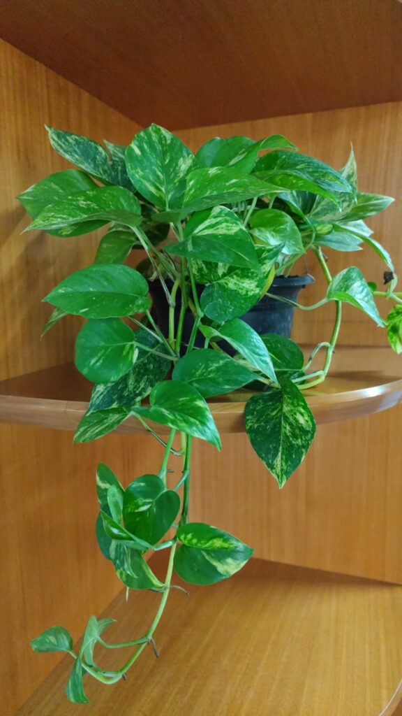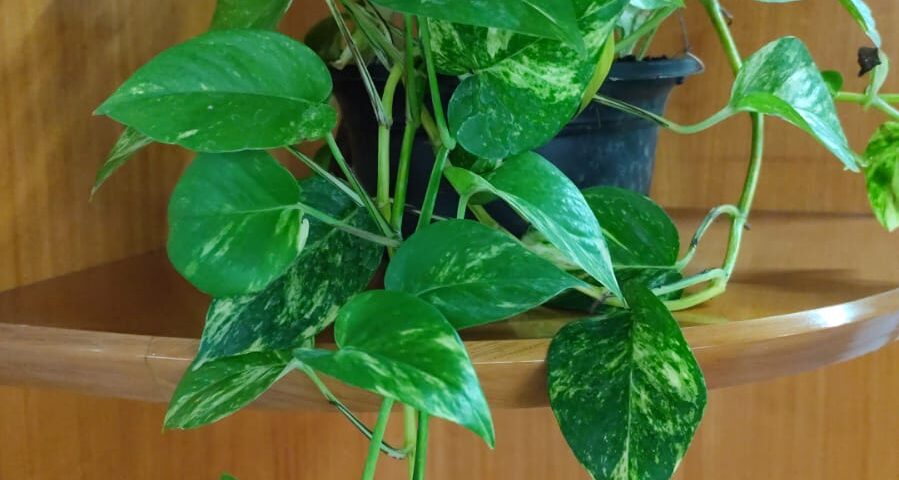 Essa planta pendente possui folhas com formato muito parecidos com coração e coloração mesclada entre verde e amarelo.